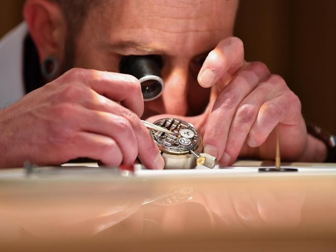 4月1日,在瑞士日内瓦举行的“钟表与奇迹”高级钟表展上,工匠展示钟表修复工艺。新华社记者 连漪 摄