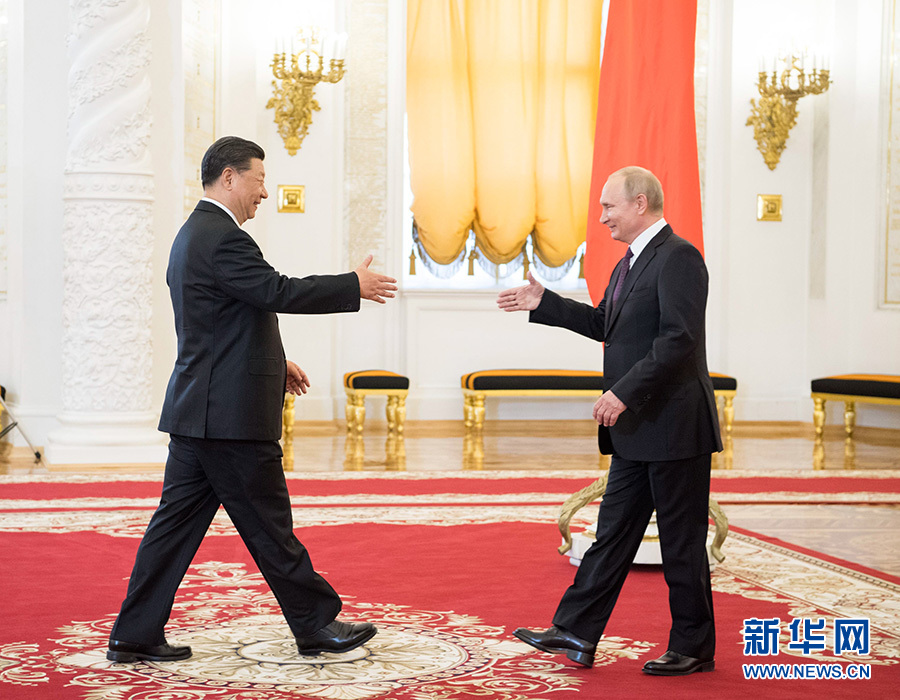 6月5日,国家主席习近平在莫斯科克里姆林宫同俄罗斯总统普京会谈。这是两国元首在会谈前握手。新华社记者 李学仁 摄