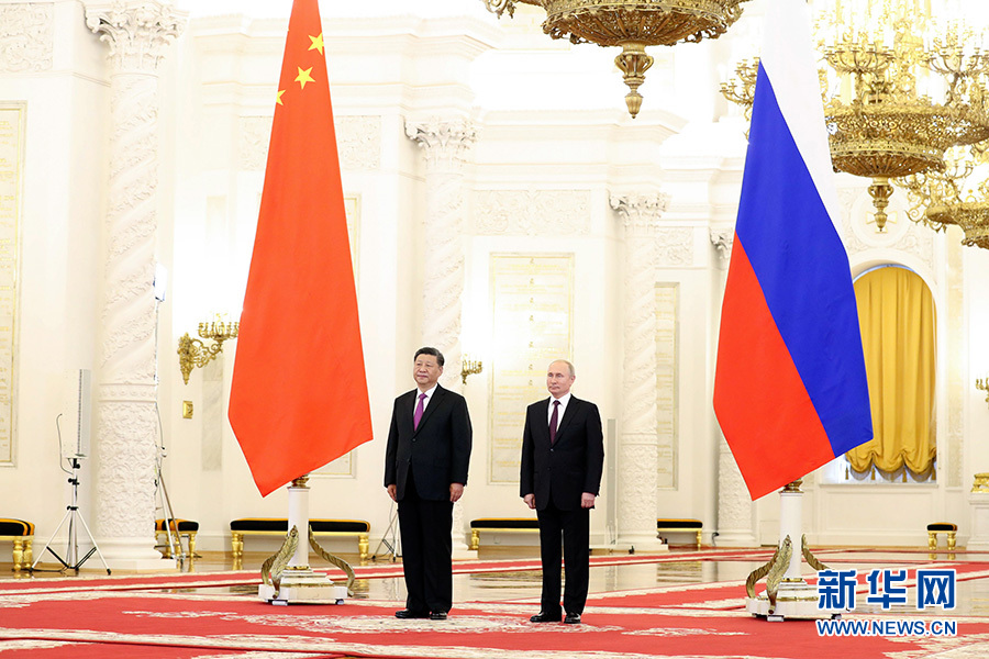 会谈前,普京总统在克里姆林宫乔治大厅为习近平举行隆重欢迎仪式。