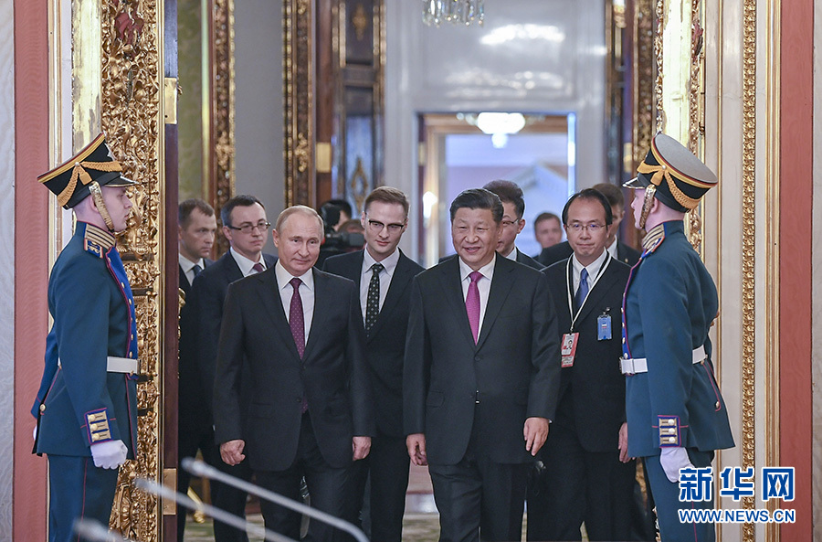 6月5日,国家主席习近平在莫斯科克里姆林宫同俄罗斯总统普京会谈。这是两国元首步入会场。新华社记者 谢环驰 摄