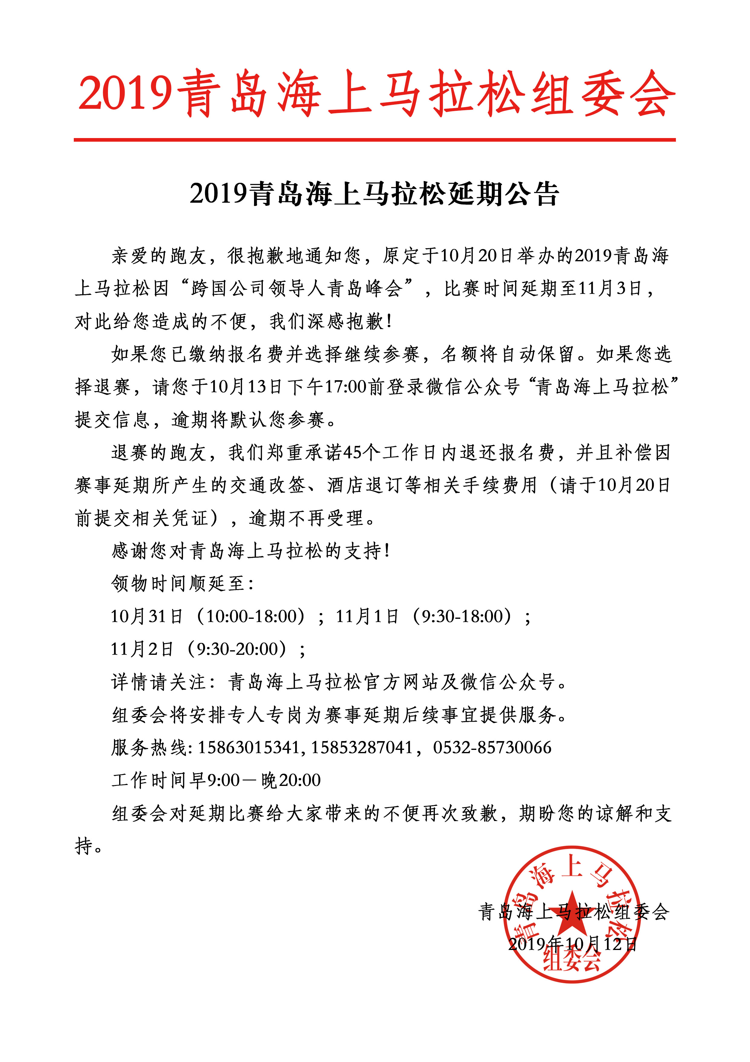 青岛新闻网10月12日讯 今天上午,记者从青岛海上马拉松组委会了解到,原定10月20日举行的2019青岛海上马拉松因“跨国公司领导人青岛峰会”,比赛时间改至2019年11月3日。