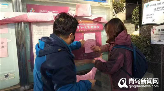 他们冒着严寒走街串巷,在居民小区宣传栏和各单元楼道内广泛张贴《市北区致市民一封信》和《市北区疫情防控公告》,温馨提示居民群众做好自我防护和健康管理,积极配合防控工作,向沿街业户宣传疫情防控知识,排查疫区来青车辆,以党员先锋模范作用让党旗在疫情防控一线高高飘扬。