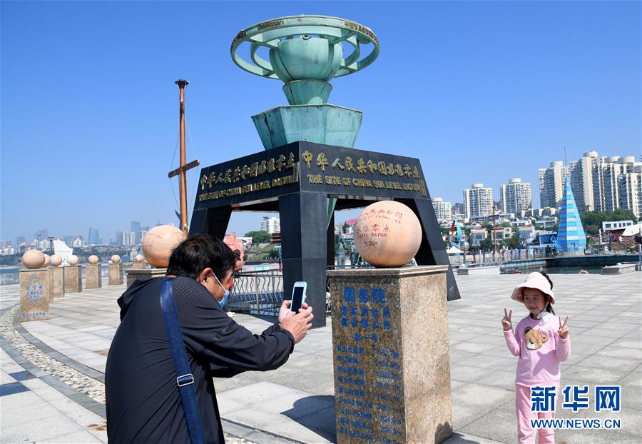 5月28日,游客在中华人民共和国水准零点景区游览。中华人民共和国水准零点景区位于青岛浮山湾东侧。2006年5月,经国家测绘局批准,由专家精确移植水准原点信息数据,在青岛银海大世界内建起了“中华人民共和国水准零点”景区,让“0海拔”概念以更平易近人的方式走到了人们身边。如今这里已建成集测绘文化、航海文化、海洋文化、青少年科普教育于一体,以中国海拔测绘零点为核心的主题公园。新华社记者 李紫恒 摄