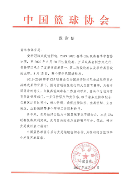 此外,中国篮协向青岛市体育局发来致谢信,感谢他们为CBA复赛成功举办做出的努力,并表达了继续密切合作,推动我国篮球事业发展的意愿。