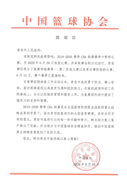 从6月20日至8月15日,2019-2020赛季CBA复赛在青岛举行,青岛赛区承办了复赛常规赛第一、第二阶段比赛以及季后赛阶段比赛。致谢信中称,“2019-2020赛季CBA联赛是在全国疫情防控阻击战取得重大战略成果的背景下,国内首项恢复进行的大型体育赛事,具有非同寻常的意义。青岛市政府付出的每一份辛勤和努力,都为助力复工复产做出了贡献,亦为地方与中国篮球协会精诚协作、推动中国篮球事业持续发展提供了良好示范。”