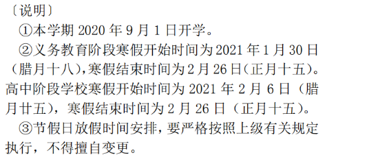 寒假安排:义务教育阶段学校寒假开始时间为2021年1月30日(腊月十八),寒假结束时间为2月26日(正月十五)。高中阶段学校寒假开始时间为2021年2月6日(腊月廿五),寒假结束时间为2月26日(正月十五)。