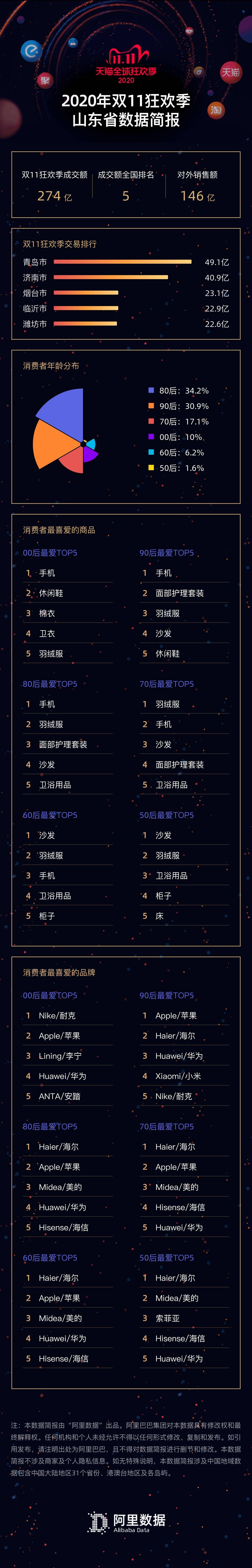 青岛日报社/观海新闻11月12日讯 今天,阿里巴巴给出统计数据:今年的2020天猫双11全球狂欢季,青岛市民共消费了49.1亿元,约占了全国总额4982亿元的百分之一,蝉联山东省城市第一名。