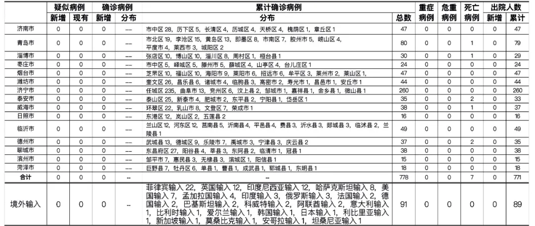 山东无新增本地疑似病例、确诊病例。累计报告确诊病例778例,死亡7例,治愈出院771例。