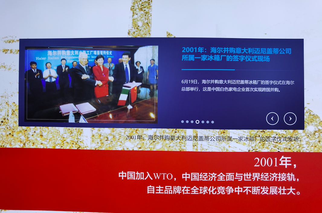 在本次中国品牌日系列活动的宣传展板展示的内容中,2001年海尔并购意大利迈尼盖蒂公司所属一家冰箱厂的签字仪式照片成为节点,这是中国白色家电企业首次实现跨国并购。当年,中国加入WTO,中国自主品牌在全球化竞争中不断发展壮大。