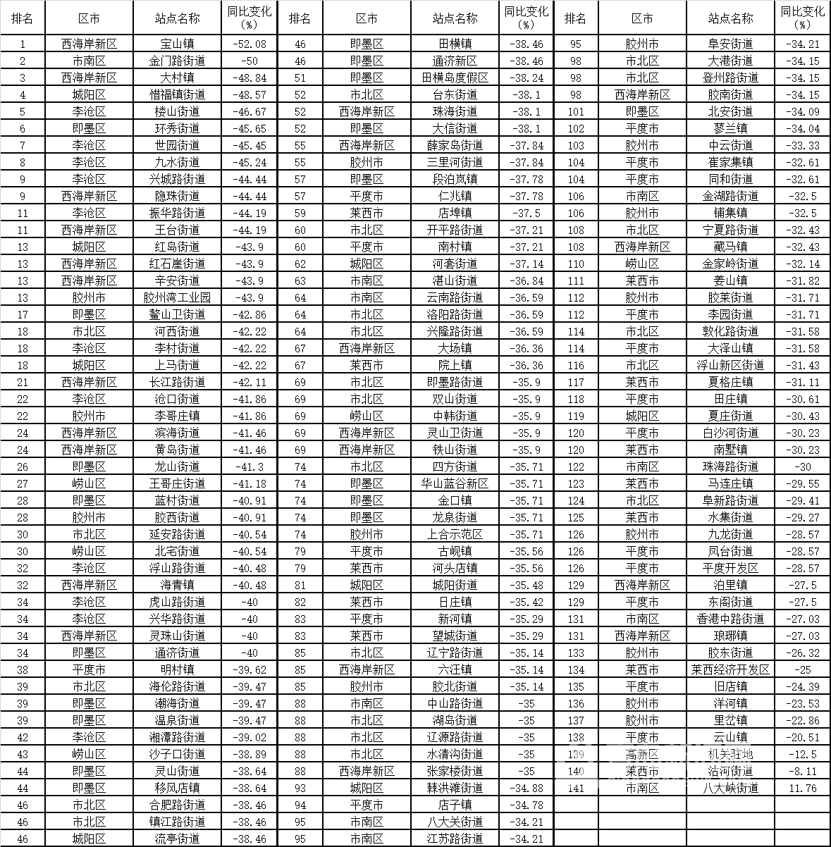 PM2.5浓度同比变化幅度由好到差排名前10名的是:西海岸-宝山镇(第1)、市南-金门路街道(第2)、西海岸-大村镇(第3)、城阳-惜福镇街道(第4)、李沧-楼山街道(第5)、即墨-环秀街道(第6)、李沧-世园街道(第7)、李沧-九水街道(第8)、李沧-兴城路街道(并列第9)、西海岸-隐珠街道(并列第9);排名后10名的是:市南-香港中路街道(并列倒数第10)、西海岸-琅琊镇(并列倒数第10)、胶州-胶东街道(倒数第9)、莱西-莱西经济开发区(倒数第8)、平度-旧店镇(倒数第7)、胶州-洋河镇(倒数第6)、胶州-里岔镇(倒数第5)、平度-云山镇(倒数第4)、高新-机关驻地(倒数第3)、莱西-沽河街道(倒数第2)、市南-八大峡街道(倒数第1)。