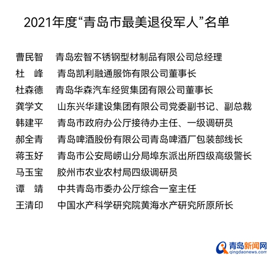 青岛新闻网7月27日讯(记者 宋波鸿)为展现退役军人风采,充分发挥先进典型示范引领作用,激励广大退役军人退役不褪色、建功新时代,6月11日,青岛市委宣传部、市退役军人局、青岛警备区政治工作处联合下发《关于评选2021年度“青岛市最美退役军人”的通知》。通知下发后,引发广大市民的密切关注和退役军人的积极参与。各区(市)、各单位按照评选条件要求,认真遴选、择优推荐。经层层选拔、网络投票、综合评审和社会公示,评选出曹民智等10名同志为2021年度“青岛市最美退役军人”。10名最美退役军人中既有为国家做出突出贡献的科技专家,又有自主创业的企业家;既有深耕一线的技术工人,又有做出突出贡献的公务人员。2021年度“青岛市最美退役军人”发布仪式将在7月29日隆重举行。