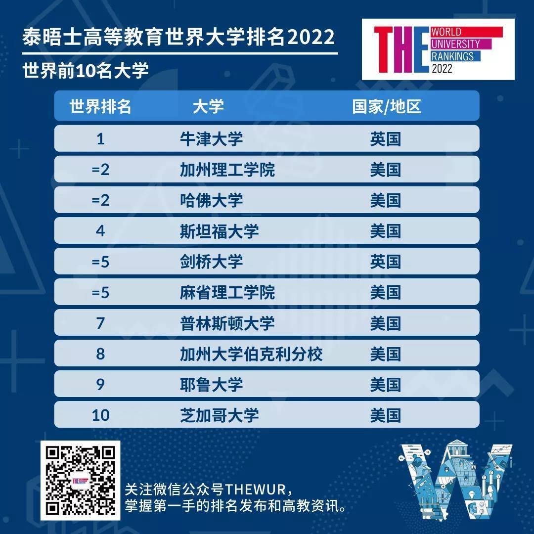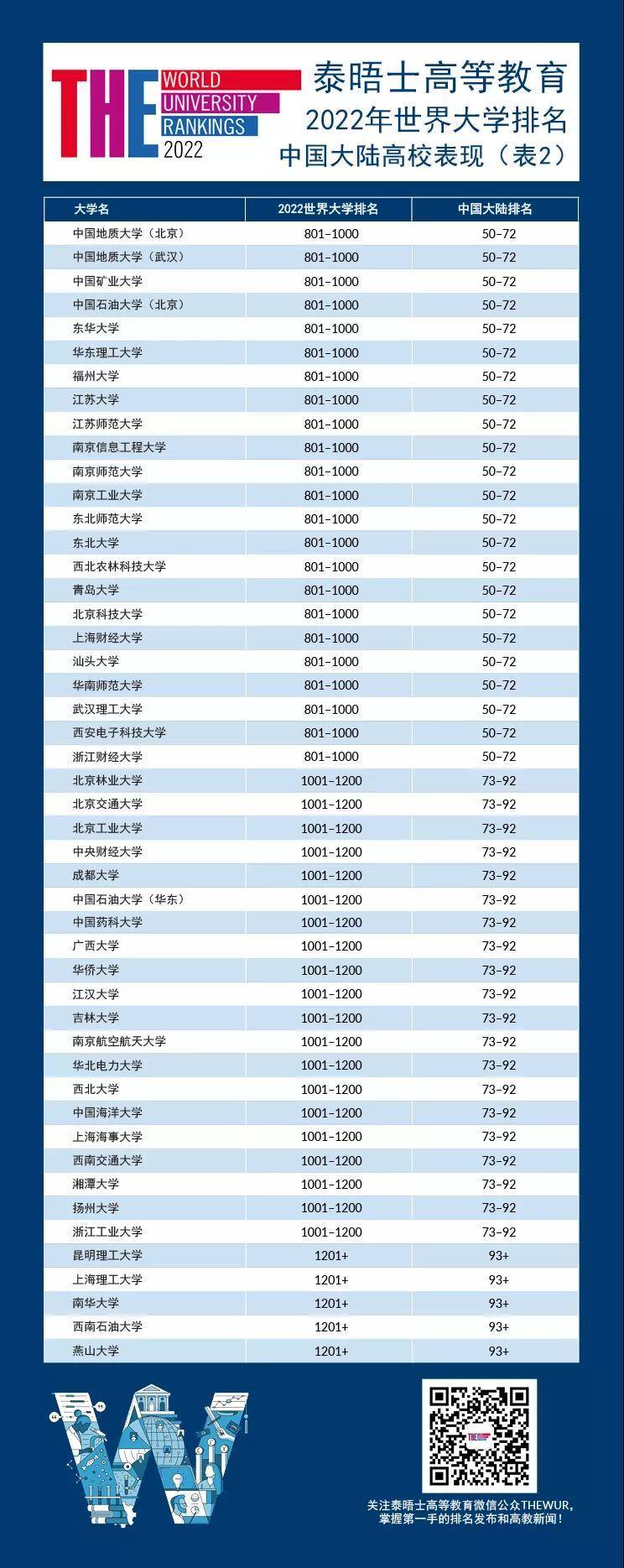 榜单显示,牛津大学连续第六年蝉联榜首;清华大学和北京大学并列第16名,与2021年世界大学排名相比,北京大学排名提升了7位,清华大学提升了4位;中国大陆有10所高校跻身前200名,其中武汉大学(第157名)、南方科技大学(第162名)和华中科技大学(第181名)为首次进入前200名的高校;中国大陆共有97所高校上榜,创历史纪录,其中8所高校首次上榜,分别为广州大学、东华大学、青岛大学、浙江财经大学、成都大学、中国石油大学(华东)、上海科技大学、西南石油大学。