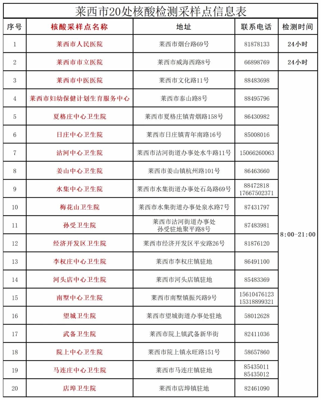 附件:莱西市20处核酸检测采样点信息表