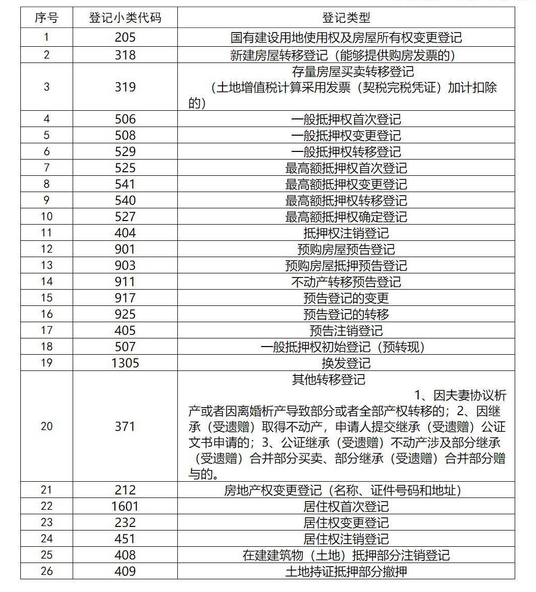 此外,还包括居住权登记类型项下的[1601]居住权首次登记、[232]居住权变更登记、[451]居住权注销登记。注销登记项下的[408]在建建筑物(土地)抵押部分注销登记、[409]土地持证抵押部分撤押。