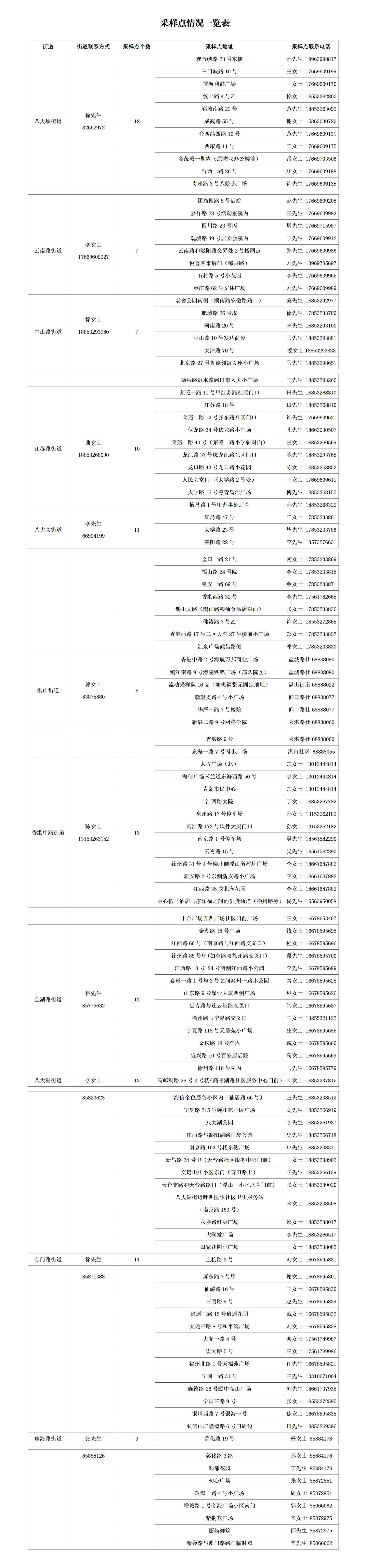 由各街道办事处统一安排采样点,具体信息详见采样点情况一览表(附后),或扫描“市南区核酸检测采样点地图小程序”,对核酸检测采样点进行查询。
