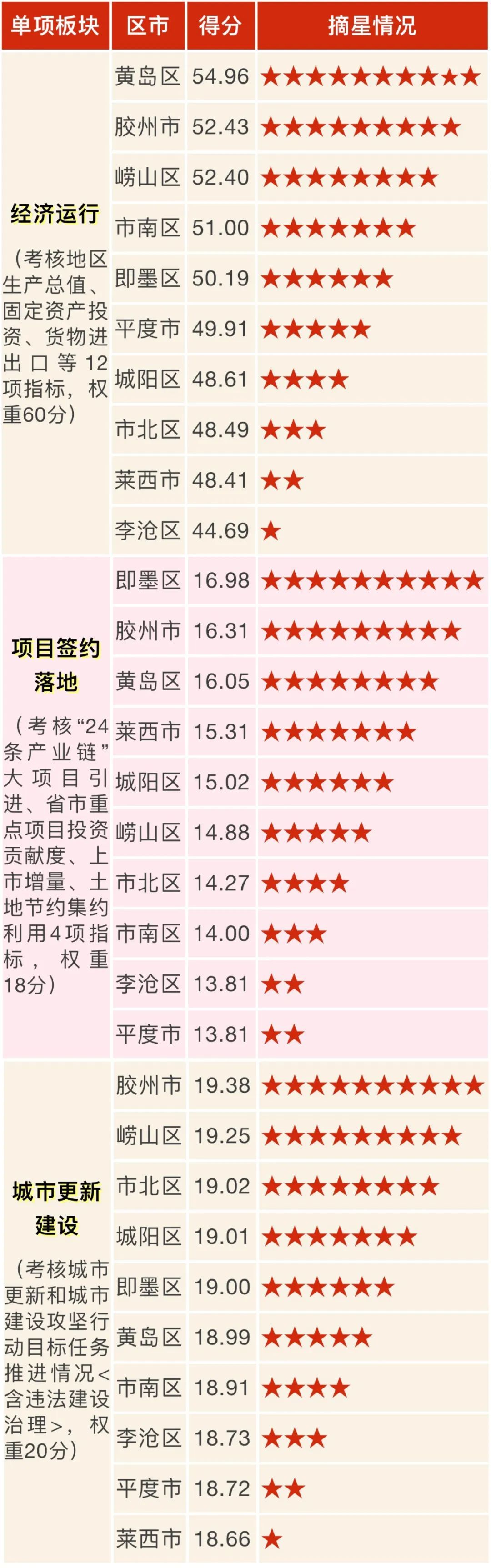 二季度“摘星夺旗”考核,包括经济运行、项目签约落地、城市更新建设3个板块17项指标。各区市综合成绩如下: