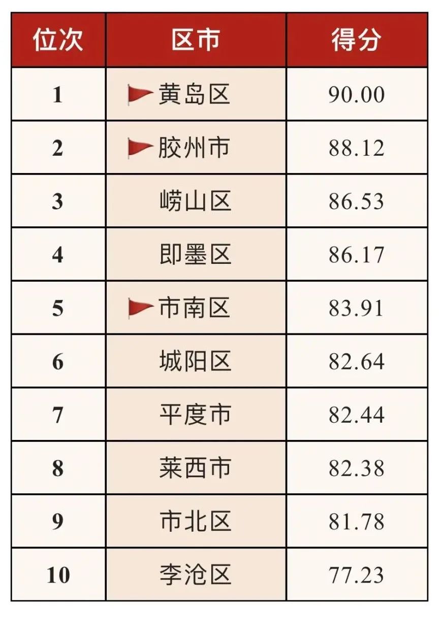 根据考核办法规定,黄岛区、胶州市综合成绩居前2位,夺得“真抓实干、勇当排头”红旗;市南区较一季度上升2个位次,夺得“加压奋进、进位赶超”红旗。