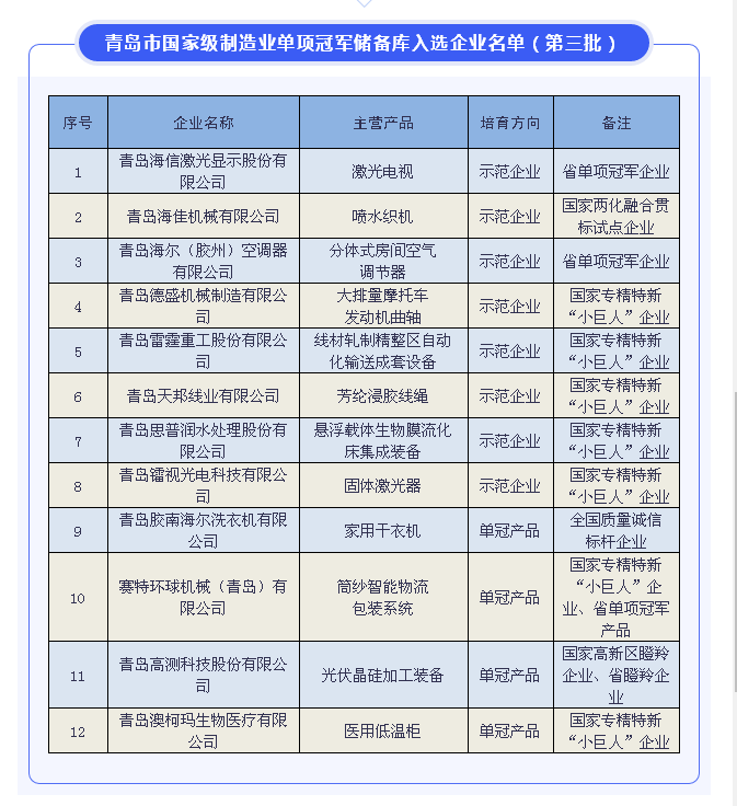 青岛日报社/观海新闻8月26日讯 市工业和信息化局近日公布第三批“青岛市国家级制造业单项冠军储备库”企业名单,海信激光显示、高测科技等12家企业入库。目前,三批累计入库企业47家,现在库企业38家。