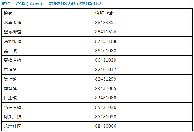 附件:各镇(街道)、龙水社区24小时报备电话