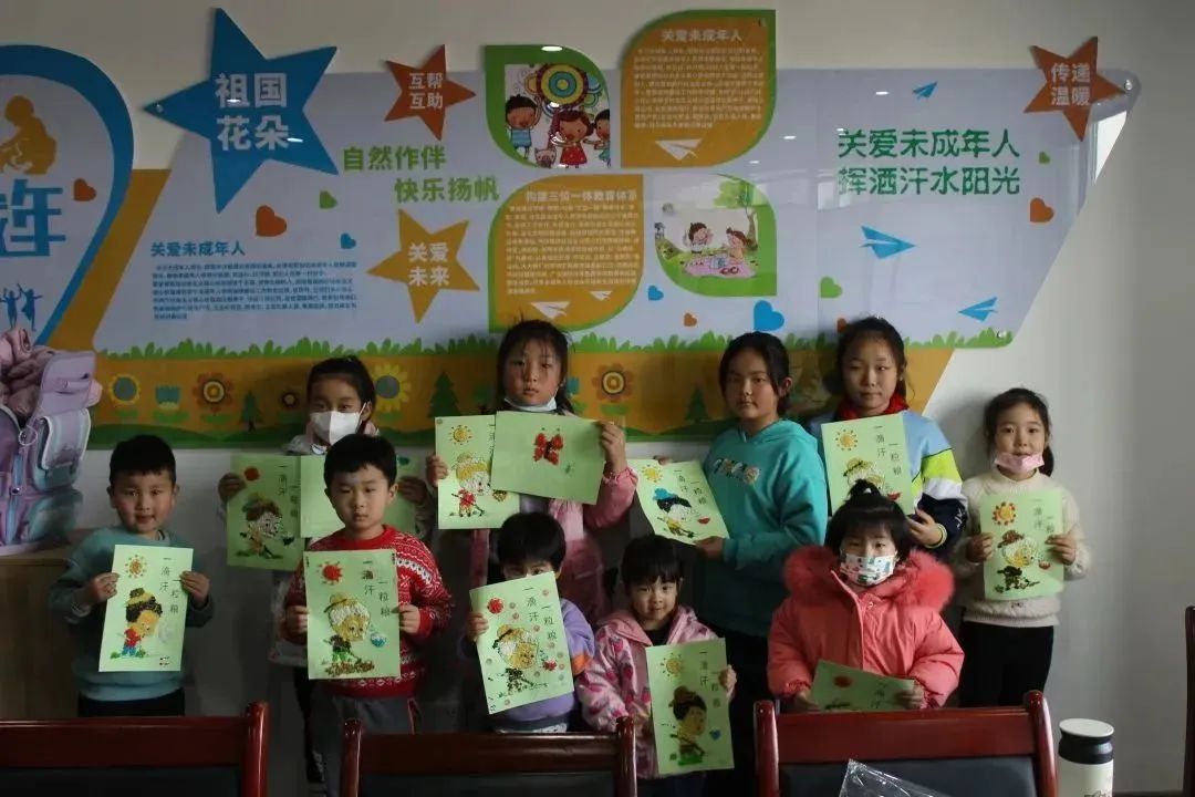 活动中,青年团员志愿者为参与活动的小朋友们介绍了五谷贴画的制作顺序和粘帖技巧,并一对一指导小朋友们完成画作。 活动结束后,孩子们展示了自己的制作成果。他们把天马行空的想象印在了画上,赋予了五谷杂粮新的生命。