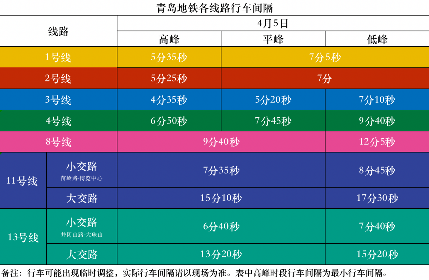 青岛日报社/观海新闻4月4日讯 记者从青岛地铁获悉,为更好地满足乘客踏青赏樱的出行需求,清明节(4月5日),青岛地铁2、3、8、13号线行车间隔压缩,具体如下: