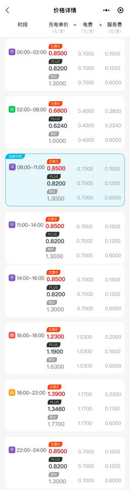 31日上午,记者现场扫描了特来电充电桩上的二维码,进入“特来电”小程序后看到,青岛巨峰路信联天地充电站“当前时段8:00-11:00”的价格为0.85元/度。点进价格详情看到充电分成了8个时段,其中凌晨2点到早上8点该电站的充电价格最低为0.68元/度;下午6点到晚上10点充电价格最高为1.39元/度,其次是下午4点到下午6点为1.23元/度,其余5个时段充电价格为0.85元/度。