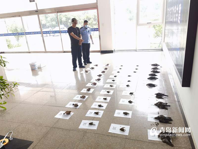 黄岛公安分局琅琊派出所辖区内有很多山林,野生动植物资源丰富,民警在日常工作加强宣传,广泛发动群众举报非法狩猎行为。8月25日,琅琊派出所民警根据线索抓获非法狩猎嫌疑人王某某,从王某某家中的冰箱内搜查出斑鸠、麻雀等三有动物死体44只。王某某供认,今年7月以来,他自制木头弹弓,购买了钢珠,时常到山林内狩猎鸟类。
