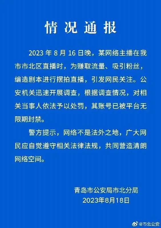 案例二:2023年8月,某网络主播在我市市北区直播时,为赚取流量、吸引粉丝,编造剧本进行摆拍直播,引发网民关注。公安机关迅速开展调查,根据调查情况,对相关当事人依法予以处罚,其账号被平台无限期封禁。