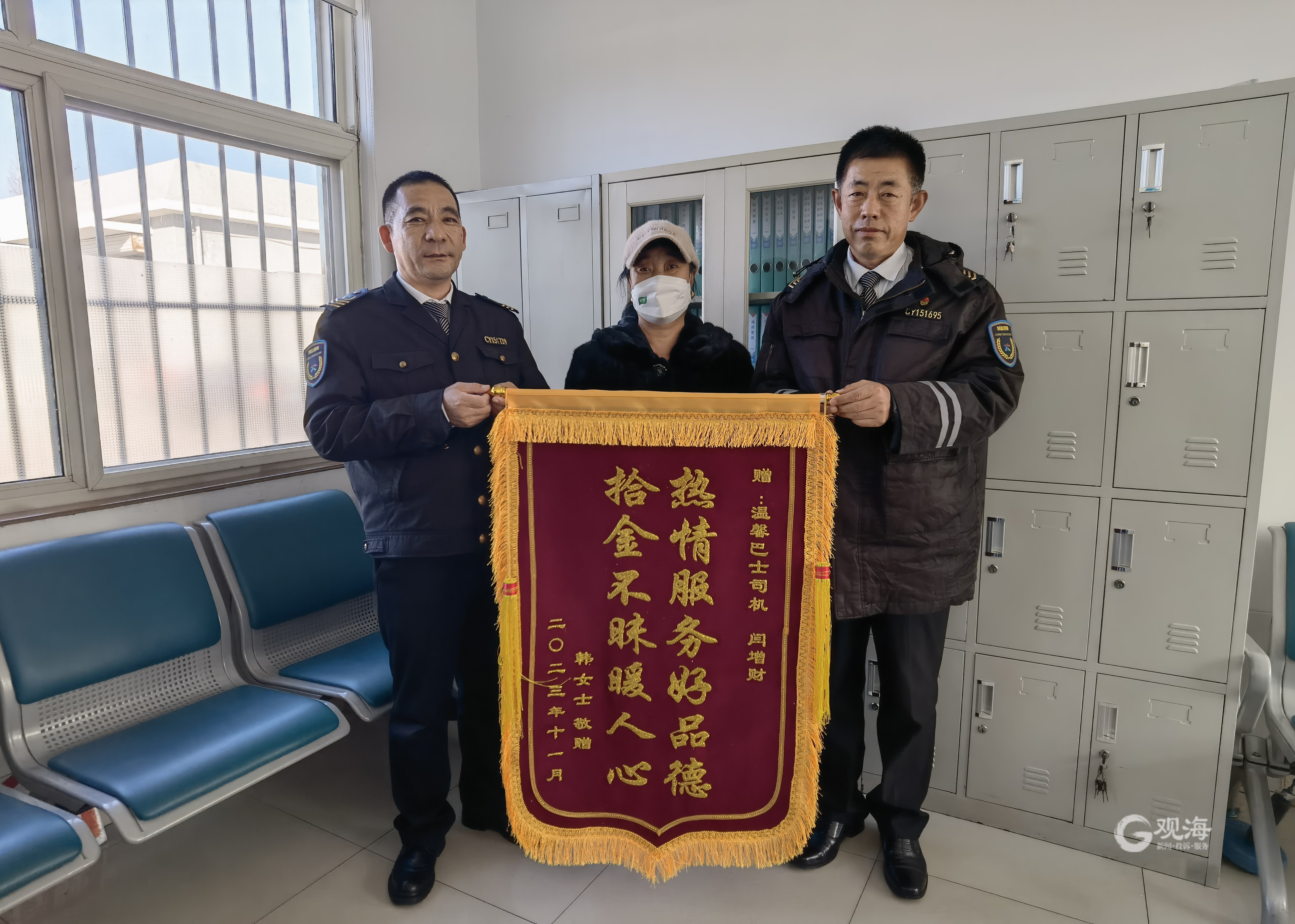 青岛日报社/观海新闻12月5日讯 今天,市民韩女士将一面印有“拾金不昧暖人心 热情服务好品德”的锦旗送到青岛城运西海岸温馨巴士五路队办公室,感谢该路队106路公交车驾驶员闫增财拾金不昧,让自己遗落的巨款及时完璧归赵。