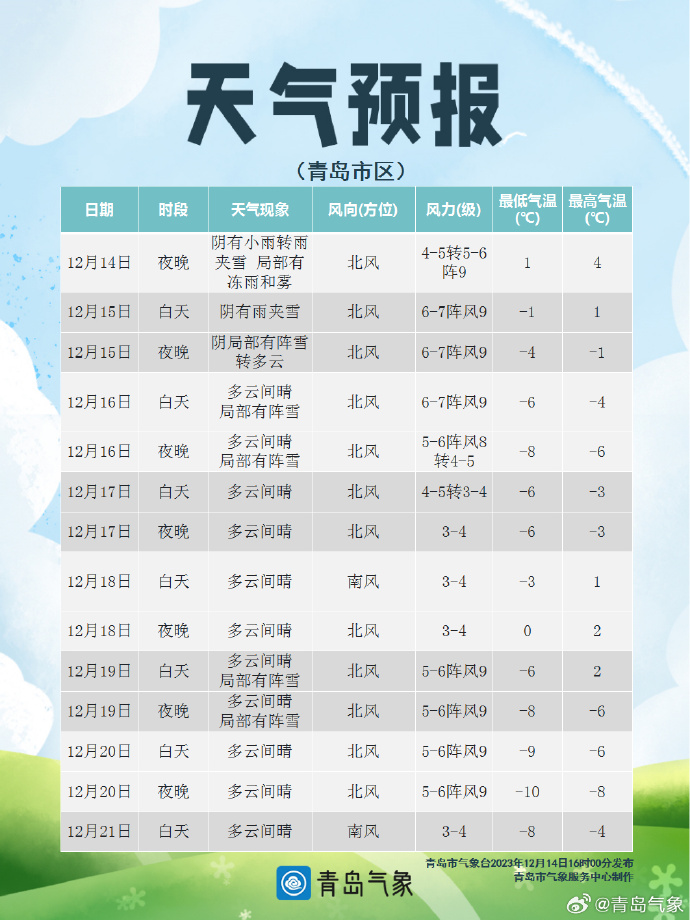 【青岛市区】今天夜间,阴有小雨转雨夹雪,局部有冻雨和雾,北风4到5级转5到6级阵风9级,明天白天,阴有雨夹雪,北风6到7级阵风9级,相对湿度60%-100%,明天最低气温-1℃,最高气温4℃。15日夜间到16日白天:阴局部有阵雪转多云,北风6到7级阵风9级,-6到-1℃。16日夜间到17日白天:多云间晴局部有阵雪,北风5到6级阵风8级转3到4级,-8到-3℃。【预报各区】今天夜间到明天白天,阴有小雨转雨夹雪或阵雪,局部有冻雨和雾,北风,海上6到7级转7到8级阵风10到11级,内陆4到5级转6到7级阵风9级,明天最低气温-4℃,最高气温3℃。15日夜间到16日白天:阴局部有阵雪转多云,北风6到7级阵风9级。16日夜间到17日白天:多云间晴局部有阵雪,北风5到6级阵风8级转3到4级。