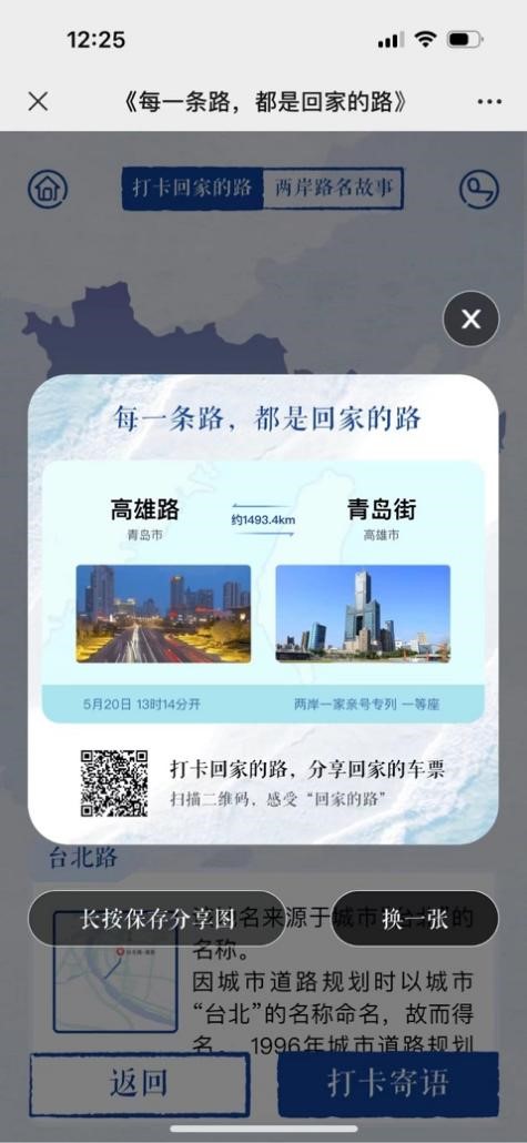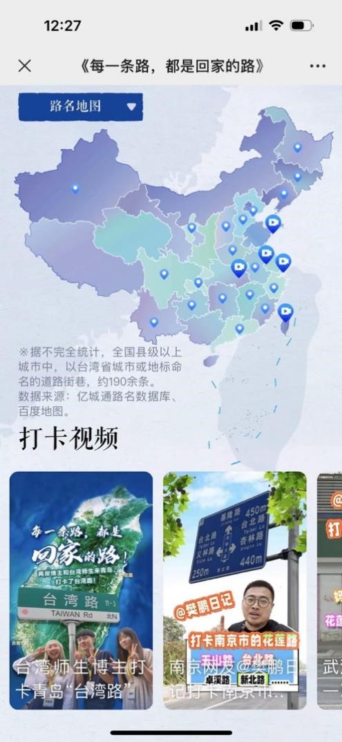 青岛的高雄路、南京的花莲路、武汉的台北路、台湾的武汉街……这些路名极具特色的地方,你最想去哪一个打卡?2023年12月30日,青岛新闻网《每一条路,都是回家的路》融媒专题上线了!街巷地名是文化历史的见证,是同根同源的联结。该专题根据两岸道路特色,聚焦路名文化,你只要拿起手机,不仅能看到青岛、上海、武汉、南京等地网友打卡“台湾路”的视频,还能看到台湾省网友打卡山东街、青岛路、武汉街的视频;在专题里你还能查到全国各地以台湾省城市名称或地标命名的道路。