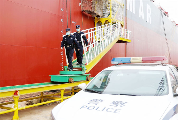 1月16日,黄岛边检站执勤民警对即将交付出境的新造船舶开展动态巡查。