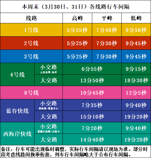 本周末(3月30日、31日),1号线最小行车间隔调整至5分35秒,2、3号线最小行车间隔均调整至5分25秒,蓝谷快线最小行车间隔调整至7分35秒,各线路具体行车间隔见下图。市民乘客可通过青岛地铁APP了解列车时刻。