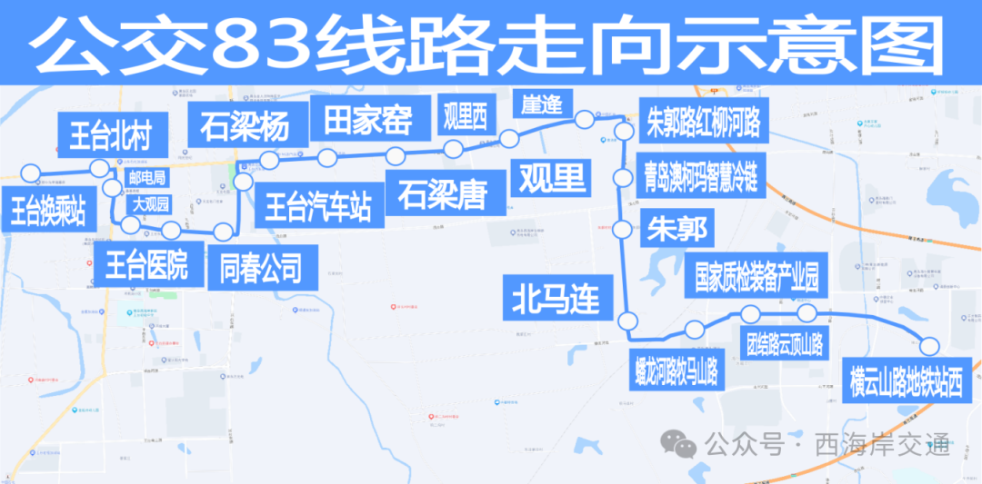 横云山路地铁站西、国家质检装备产业园、团结路云顶山路、蟠龙河路牧马山路、北马连、朱郭、青岛澳柯玛智慧冷链、朱郭路红柳河路、崖逄、观里、观里西、石梁唐、田家窑、石梁杨、王台汽车站、同春公司、王台医院、大观园、邮电局、王台北村、王台换乘站,共21处站点。