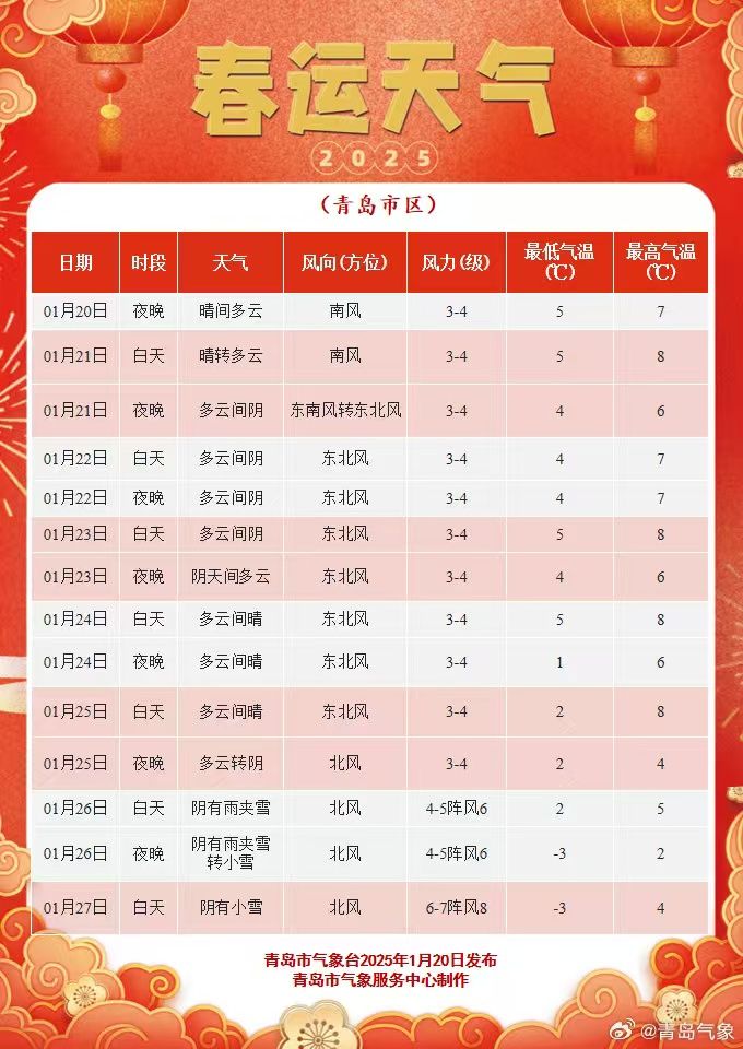 25—26日,全省天气阴,菏泽、济宁和鲁西北地区有小雨或雨夹雪转小到中雪局部大雪,其他地区有小雨或雨夹雪转小雪。北风,滨州、东营、潍坊、日照、内陆湖面和半岛地区3~4级增强到5~6级阵风7~8级,其他地区3~4级增强到4~5级阵风6~7级。