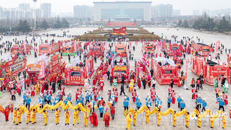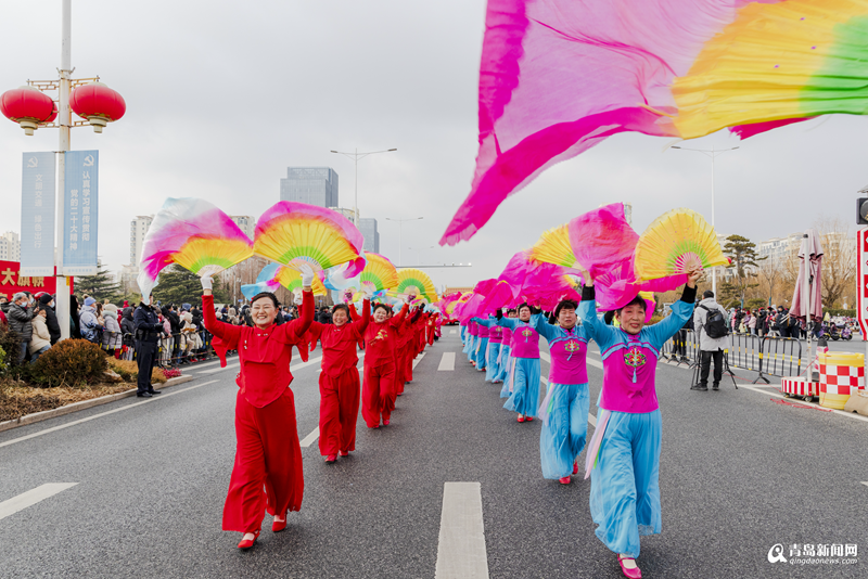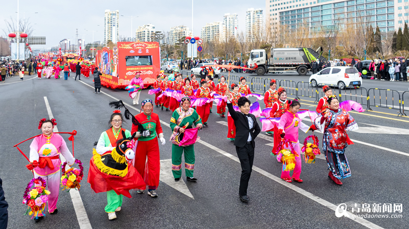 鼓点如春雷炸响,唢呐与铜锣齐鸣,平日车水马龙的北京路、烟台路一带,如今已是鱼龙齐舞。此次巡游活动汇聚了由各镇街以及市教育和体育局、市住房和城乡建设局、医疗集团等精心组织的21支秧歌队伍,他们身着节日盛装,精神抖擞,在一辆辆设计精美、独具特色的花车引领下大步向前,成为城市中一道道流动的风景线。