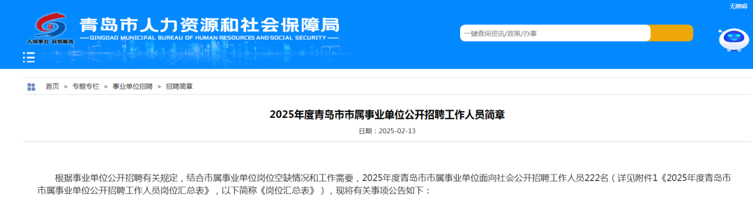 根据事业单位公开招聘有关规定,结合市属事业单位岗位空缺情况和工作需要,2025年度青岛市市属事业单位面向社会公开招聘工作人员222名(详见附件1《2025年度青岛市市属事业单位公开招聘工作人员岗位汇总表》,以下简称《岗位汇总表》),现将有关事项公告如下: