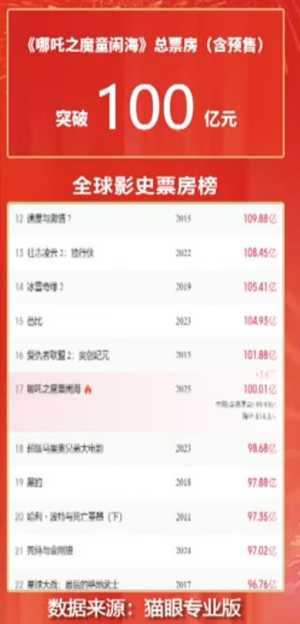 青岛新闻网2月13日讯(记者 江伟)今天,中国电影历史上首部百亿票房影片诞生!根据猫眼专业版数据,截至发稿时,《哪吒之魔童闹海》票房已破百亿(含预售),值得一提的是,该影片自首映以来仅用了16天便达成此成就,专业机构预测其未来总票房有望达到160亿元。