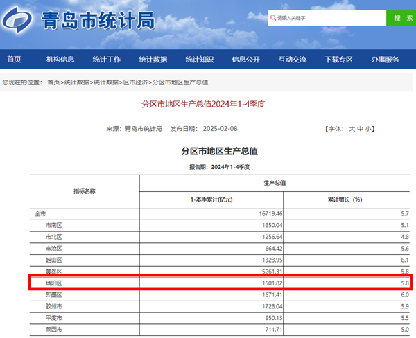 青岛新闻网2月14日讯(记者 任俊峰)日前,青岛市统计局官网最新公布了青岛市下辖10区市2024年经济运行情况。其中2024年城阳区经济生产总值1501.82亿元,与上一年相比GDP增速达到5.8%,增速位居全市前列,表现堪称亮眼。