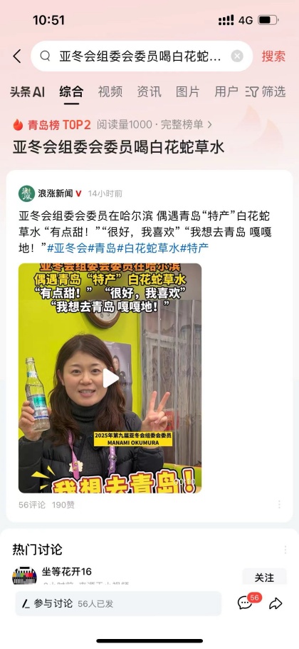 亚冬会开幕式当晚,前方报道团队兵分两路,同步开展工作。一路记者深入开幕式现场,近距离见证亚冬会开幕式的精彩时刻,及时传回第一手视频素材。另一路记者则在场馆外搭建直播机位,尽管面临零下二十摄氏度的严寒天气、核心区域道路封控以及安保管理严格等重重困难,但记者们还是顺利完成了140分钟的直播。在与青岛第二演播室实现实时联动的同时,还意外偶遇亚冬会组委会委员和印尼代表团工作人员。记者们抓住机会,热情邀请对方品尝白花蛇草水和崂山可乐,积极推介家乡美食,成功制作出短视频《亚冬会组委会委员在哈尔滨偶遇青岛“特产”白花蛇草水“有点甜”“很好我喜欢”“我想去青岛嘎嘎地”》《国际友人在亚冬会偶遇青岛特产崂山可乐出圈美得冒泡泡》,视频内容新颖有趣,得到了各方一致认可,“亚冬会组委会委员品尝崂山白花蛇草水”词条更是登上微博同城榜热搜第二位。