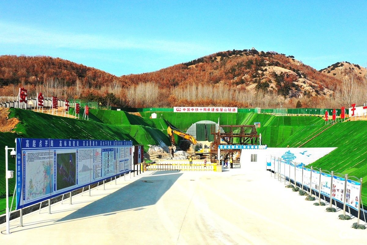 中铁十局承建的潍宿高铁至青岛连接线工程1标正线长度32.56千米。全线共设洋河口站、青岛西站2座车站及隧道3处。其中,报屋山隧道位于青岛市西海岸新区境内,为越岭双线隧道,全长1835米,是潍宿高铁青岛连接线重点控制性工程之一。隧道围岩条件复杂,Ⅳ、V级围岩占比高,且隧道紧邻既有青盐铁路黄山屯隧道,爆破振速要求高,且爆破作业仅能利用铁路天窗点时段施工,每日爆破一次,工期和安全压力巨大。