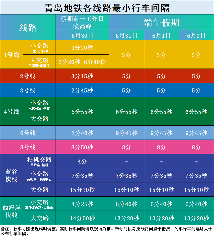 端午假期临近,为更好地满足乘客出行需求,青岛地铁将于5月30日至6月2日延长夜间末车时间、缩短行车间隔,让市民和游客畅行无忧。