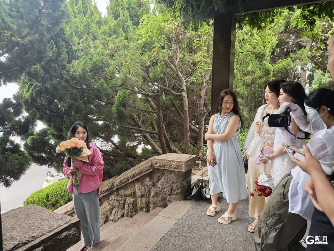 位于太平路的李慰农公园,掩映在松树下的一处石梯前围满了年轻游客,摄影师一边举着相机,一边指导着远处站在海边栏杆处的游客摆出各种拍照姿势。随着相机快门按下,一张清新文艺的照片“出片”,照片中游客站在蔚蓝海边,远处是栈桥回澜阁,周围是一圈绿色树影。