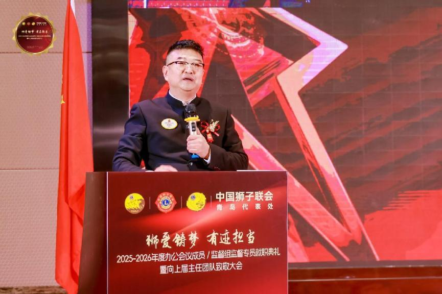 中国狮子联会副会长彭长军宣读中国狮子联会关于任命青岛代表处2025-2026年度办公会议成员及监督组监督专员的通知,主持了交接仪式,见证了青岛代表处新一任领导团队的就职宣誓。中国狮子联会副会长顾兆建向刚履新的领导狮友送上热烈祝贺,接着对为公益事业奉献良多的历届领导狮友表达了崇高敬意。