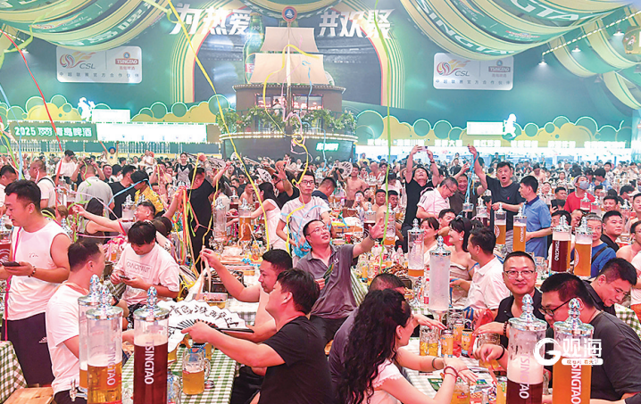 市民游客在金沙滩啤酒城的啤酒大篷内举杯畅饮。