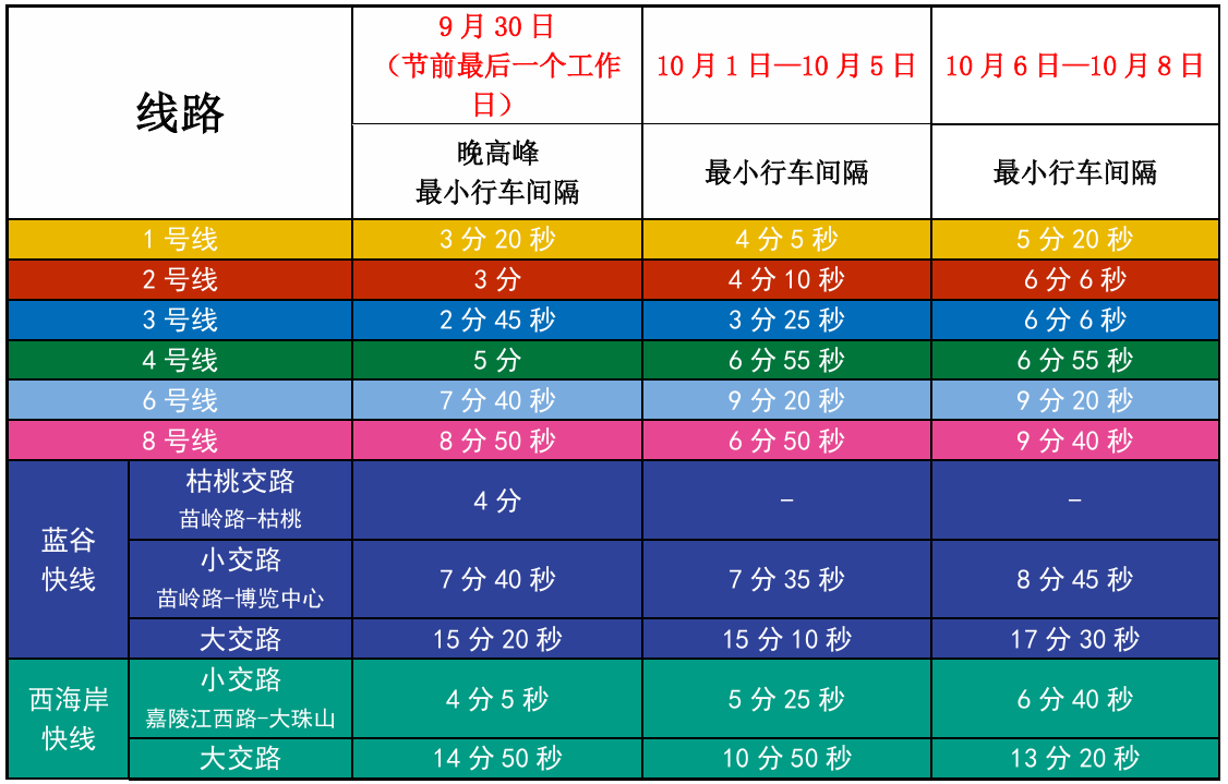 节前最后一个工作日及假期期间各线路最小行车间隔如下。