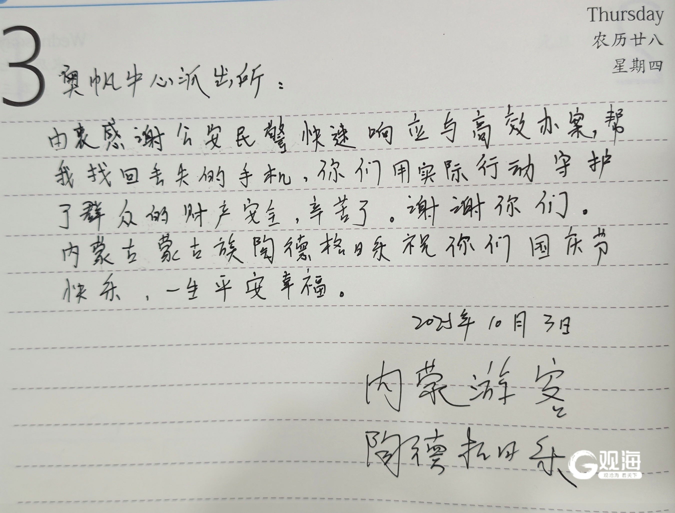 青岛日报社/观海新闻10月4日讯 “太感谢青岛民警了!不仅帮我找回手机,还让我感受到了这座城市的温暖!”10月3日,内蒙古女游客在奥帆中心派出所领回遗落的手机时,激动地向民警和出租车司机连连道谢,手写一封感谢信,为这场高效暖心的寻物行动点赞。