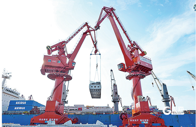 在山东港口青岛港大港港区的码头,运往海外的特种大件设备正在装船。