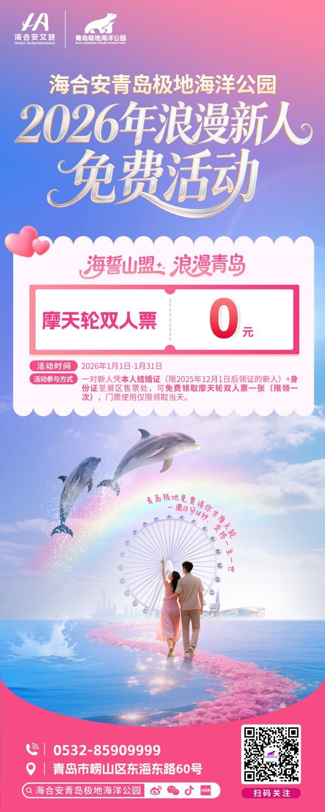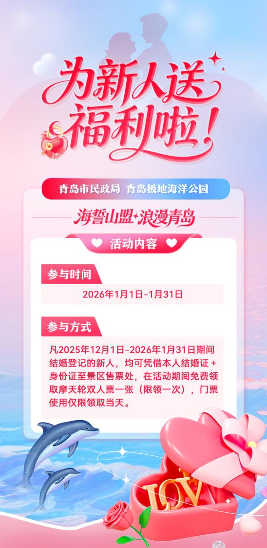 本次“海誓山盟·浪漫青岛”甜蜜公益行时间为2026年1月1日-1月31日,凡是2025年12月1日-2026年1月31日期间结婚登记的新人,均可凭借本人结婚证+身份证至景区售票处,在活动期间免费领取摩天轮双人票一张(限领一次),门票使用仅限领取当天。