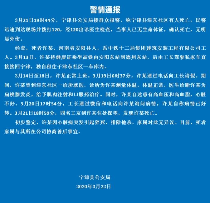 经查,死者许某,河南省安阳县人,系中铁十二局集团建筑安装工程有限公司工人。3月13日,许某持健康证乘坐高铁由安阳东站到德州东站,后由工长驾驶私家车直接接回宁津,独自租住于津东社区一车库内。